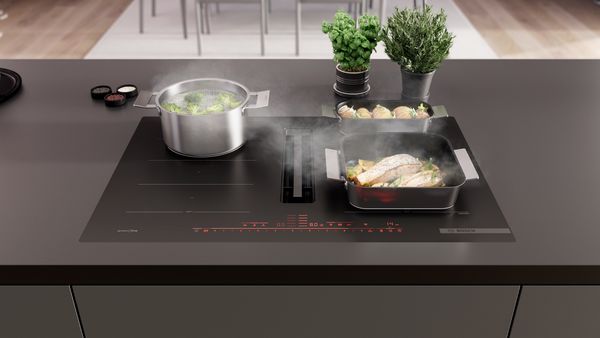 Les plaques de cuisson Bosch noires mates allient design épuré et fonctionnalités intelligentes. Grâce à la hotte intégrée, la vapeur et les odeurs disparaissent directement à la source, pour que votre cuisine reste fraîche et agréable. La surface mate en verre céramique est élégante, moins sensible aux traces de doigts et facile à nettoyer.