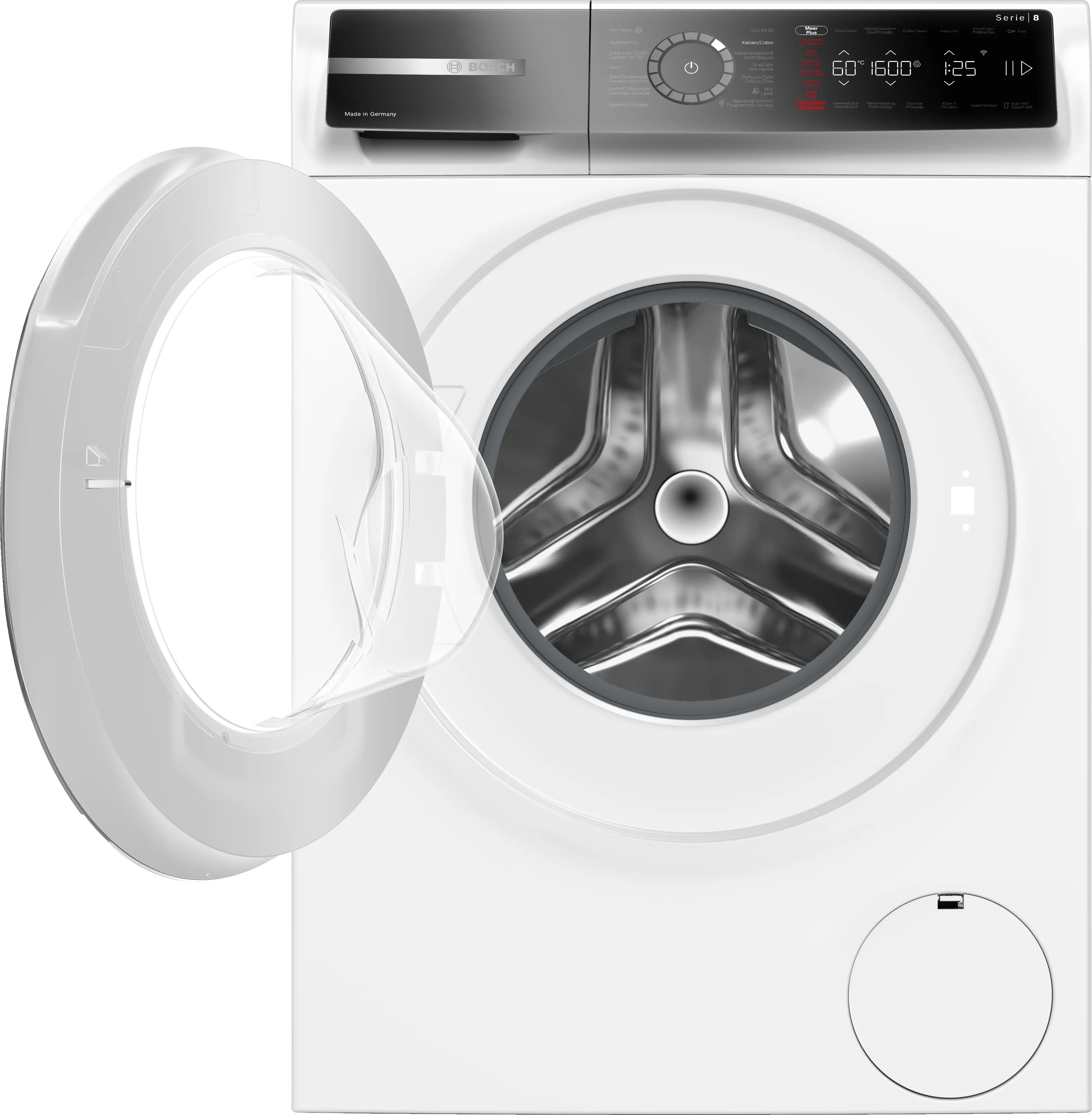 Vitesse d'essorage max.Note de bas de page 1 : La vitesse d'essorage maximale est automatiquement réduite en cas de déséquilibre.: 1600 tours/min