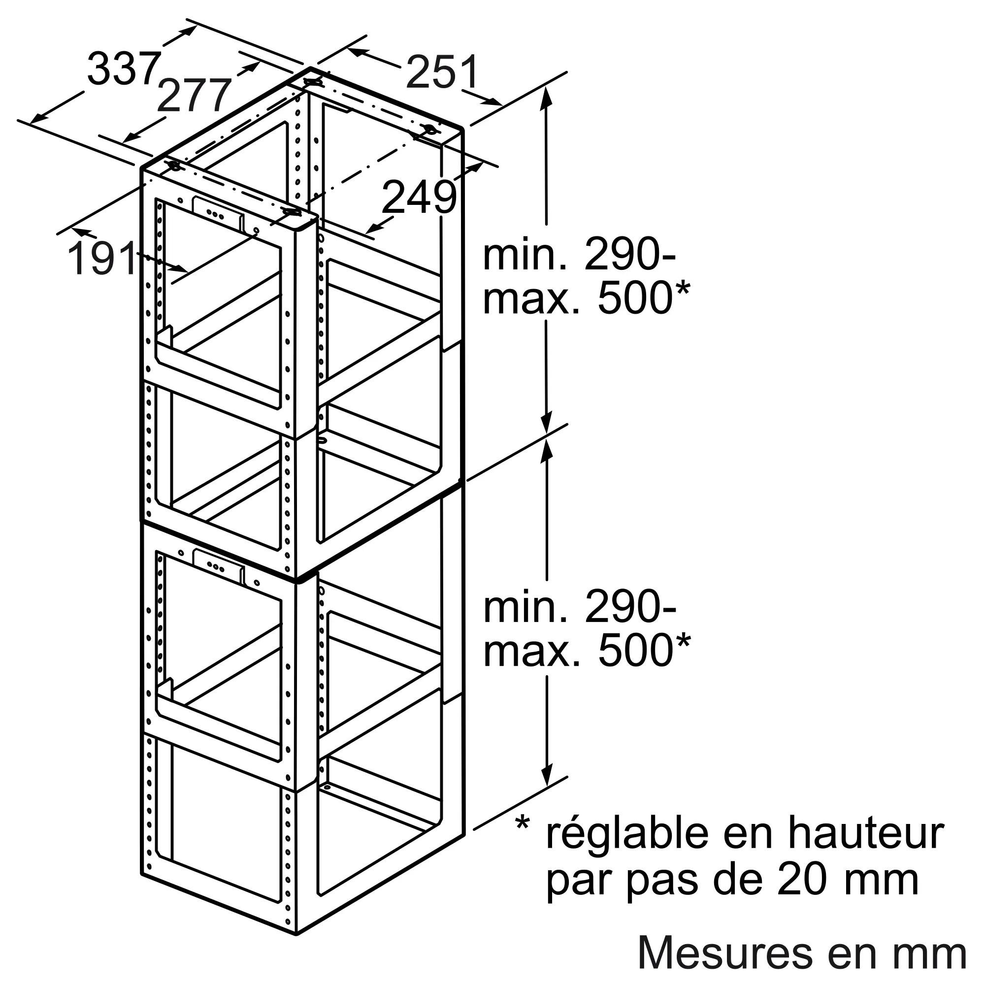 Pour une hauteur de la partie cheminée de 1100mm à 1500mm. La hauteur totale de la hotte dépend de la type de hotte