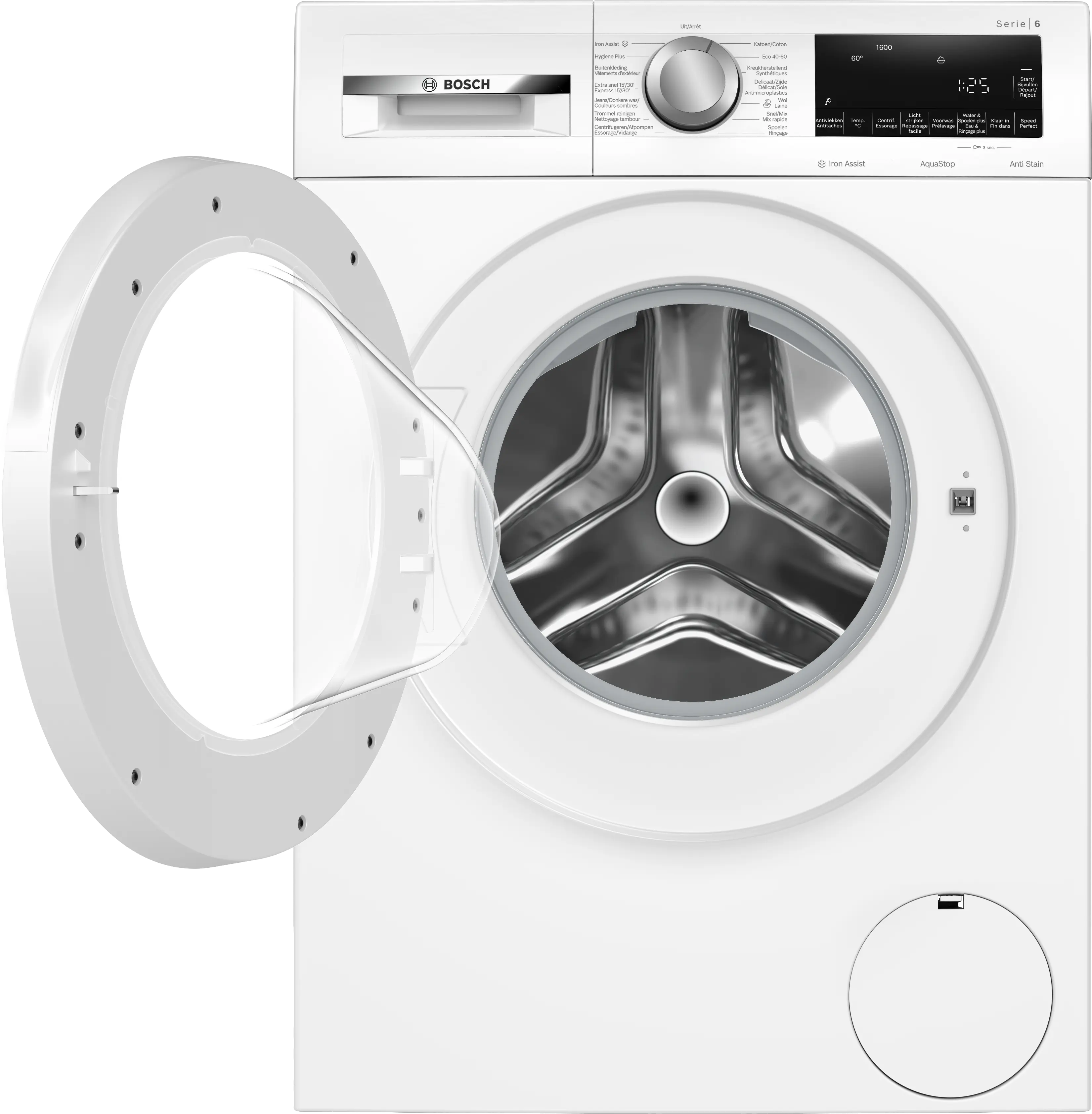 Vitesse d'essorage max.Note de bas de page 1 : La vitesse d'essorage maximale est automatiquement réduite en cas de déséquilibre.: 1600 tours/min