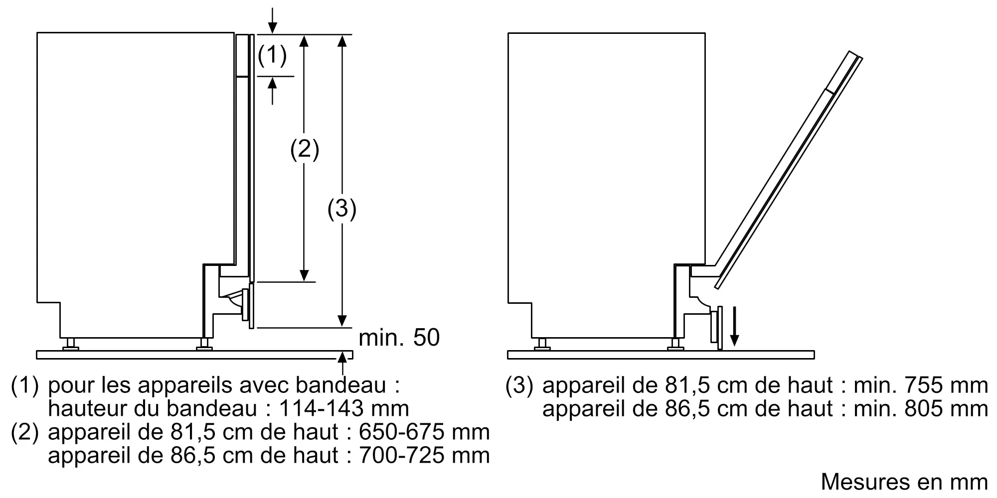 - 650 - 675 mm pour les lave-vaisselle de 81,5 cm de hauteur